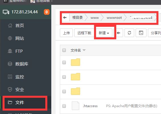 打开宝塔面板,选择文件,找到相应的目录,在相应IP目录下新建文件夹;比如我刚刚写的版本代号是a,那我就新建a这个文件夹